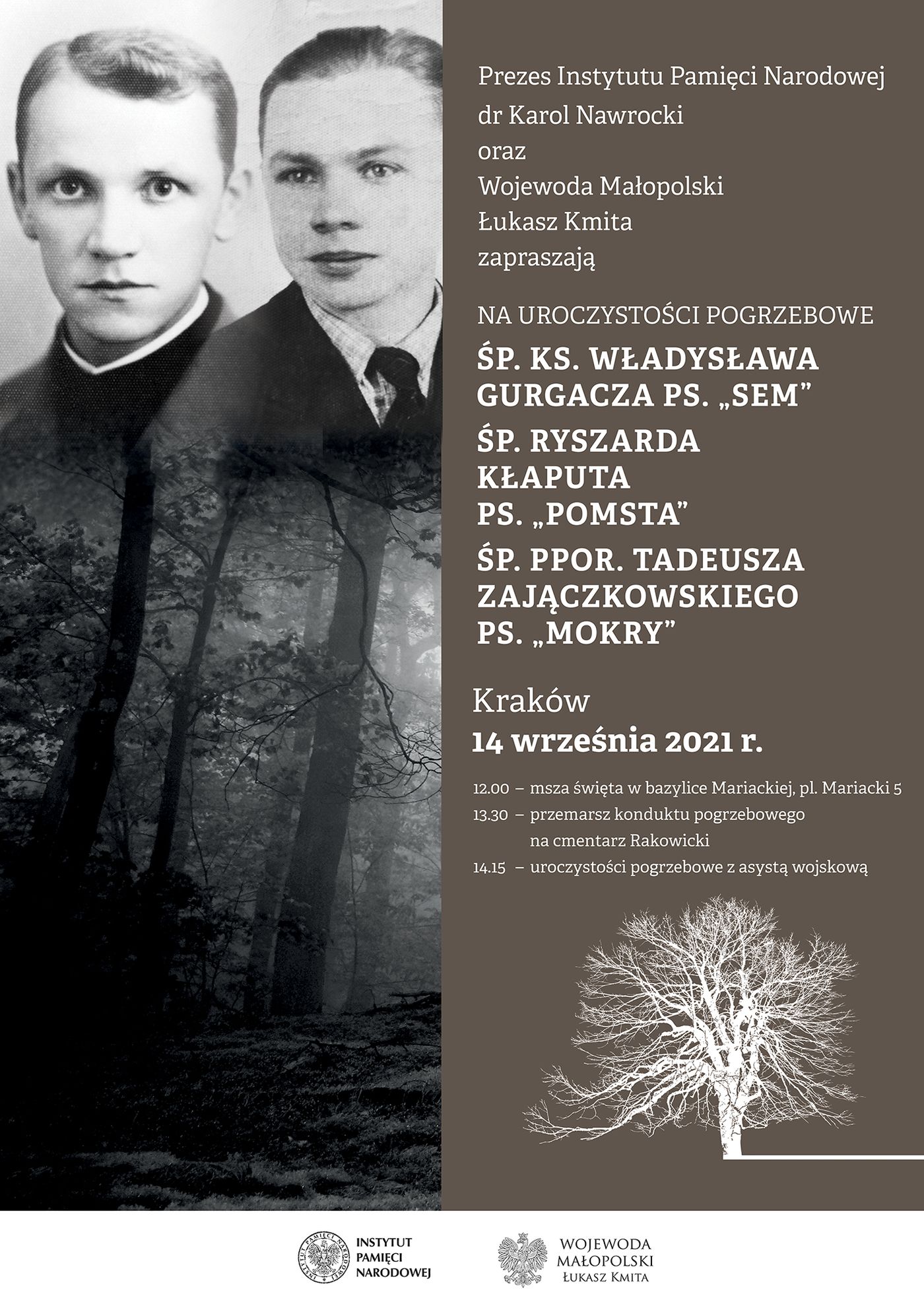 Prezes IPN dr Karol Nawrocki i Wojewoda Małopolski Łukasz Kmita zapraszają na uroczystości pogrzebowe Żołnierzy Wyklętych: ks. Władysława Gurgacza „Sema”, Ryszarda Kłaputa „Pomsty” i ppor. Tadeusza Zajączkowskiego „Mokrego”, które odbędą się 14 września 2021 r. w Krakowie.